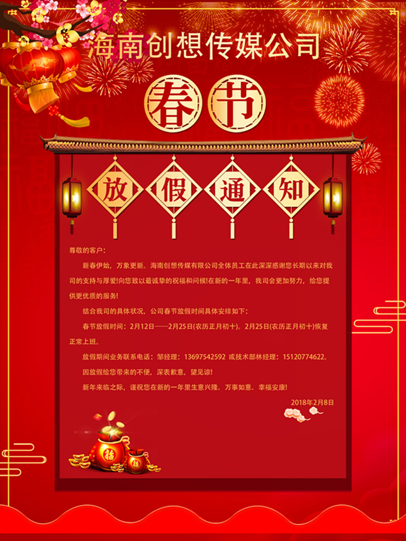 新春伊始,萬象更新。海南創(chuàng)想未來文化傳媒有限公司全體員工在此深深感謝您長期以來對我司的支持與厚愛!向您致以最誠摯的祝福和問候!在新的一年里,我司會更加努力,給您提供更優(yōu)質(zhì)的服務(wù)!